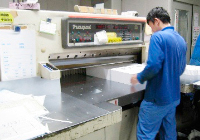 印刷後の紙を仕上がりサイズにカットします。1回で2000枚ぐらいを効率よく断裁できます。